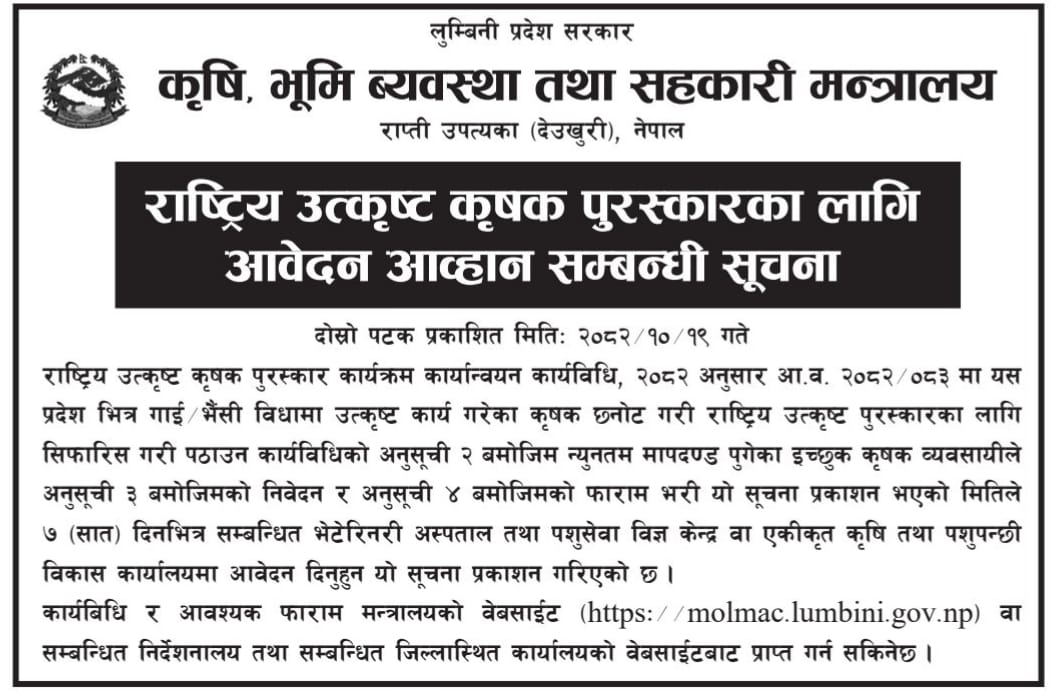 राष्ट्रिय उत्कृष्ट कृषक पुरस्कारका लागि आवेदन आव्हान सम्बन्धी सूचना